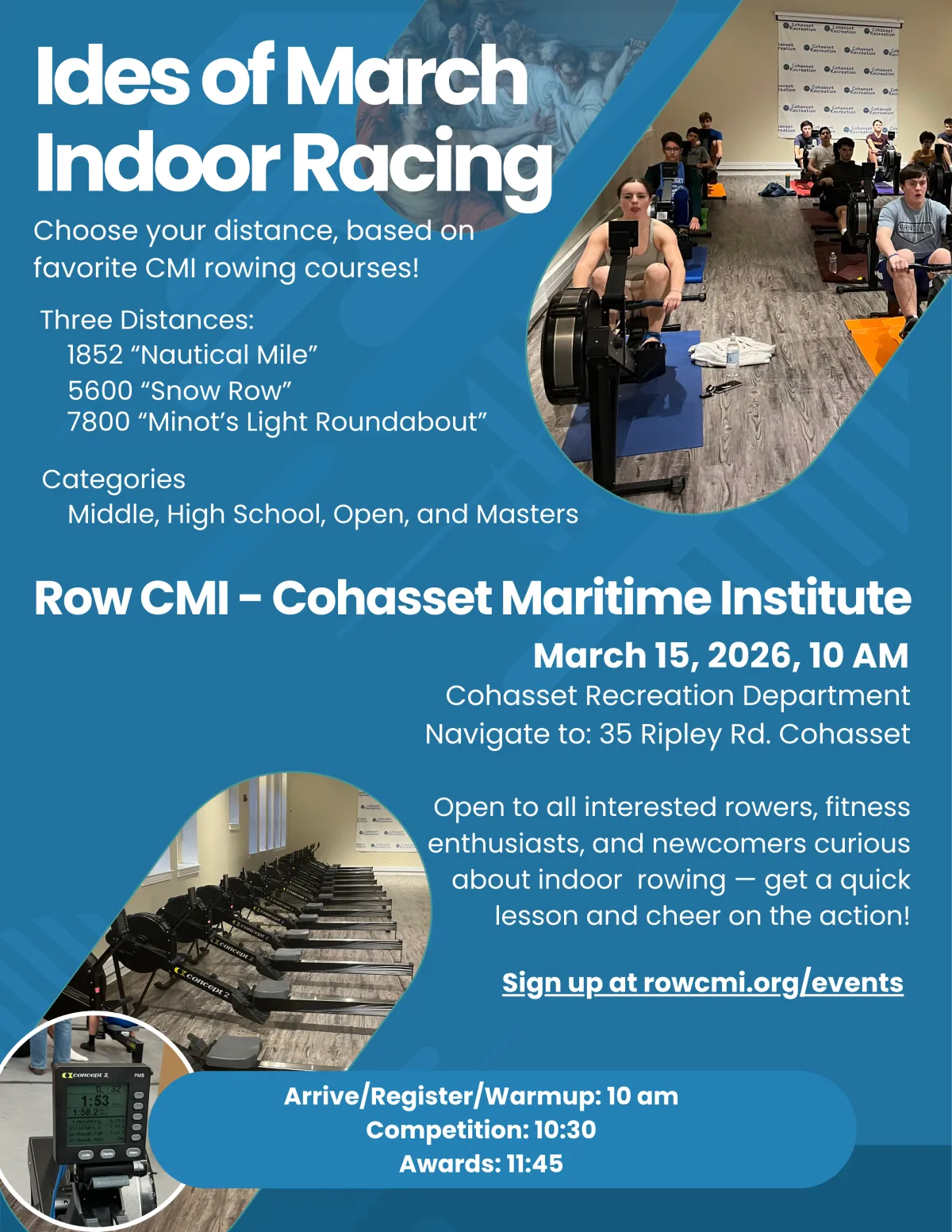 Join us for a fun, high-energy indoor race for youth and adults from any club! The Ides of March Indoor Race is part friendly competition, part fitness check. Categories are Middle School, High School, Open, and Masters rowers — choose your distance and race a favorite CMI course on the erg. Come race or cheer, and wrap up the indoor season together!
